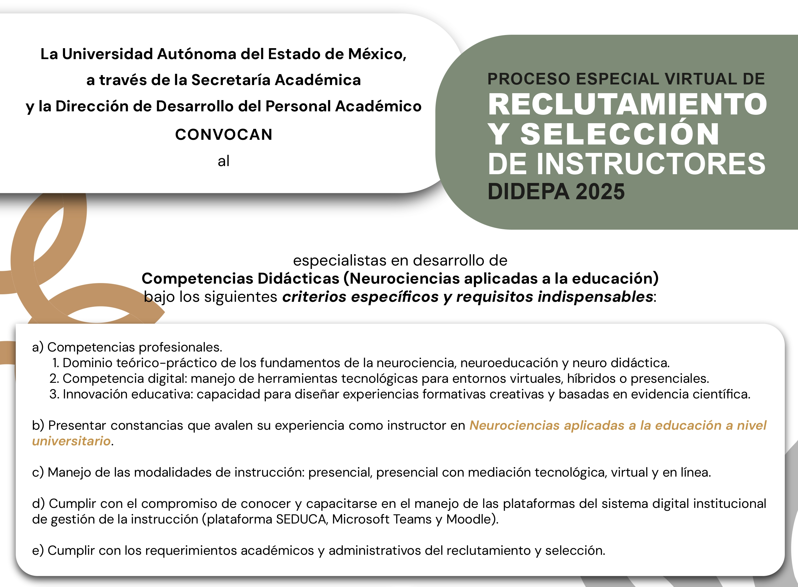 Para más información, consultar la página web o comunicarse con la Dirección de Desarrollo del Personal Académico, teléfonos 722 214 5601 y 722 214 8363, correo didepa@uaemex.mx